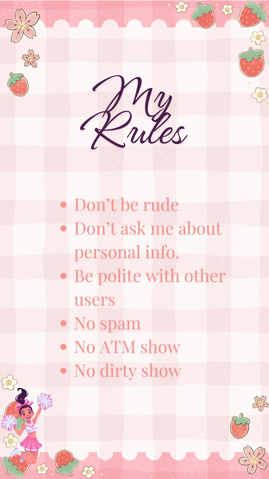 Doggy Style, Anal, Spanking, Handjob, Dildo in pussy extra 140 tks, Anal show extra 600 tks, Control Lush 280 tks, Squirt Extra 350, Fingering, Striptease, Foot Fetish, Sex Toys, Masturbation, Footjob, Oil Show, grabacion gratis, todo incluido